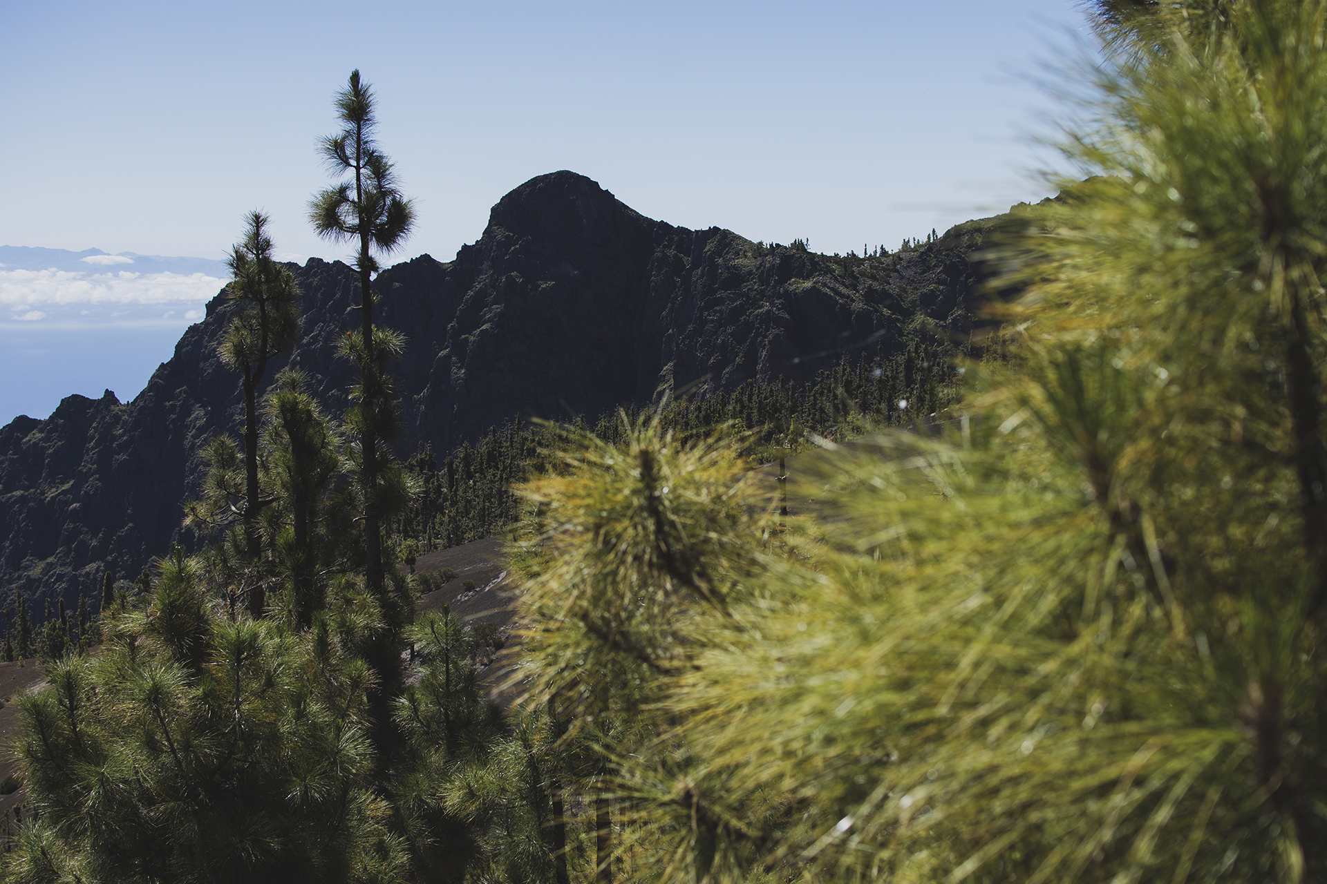 Hay otro bosque en el siguiente escalón, el bosque de pino canario (Pinus canariensis), un pino característico por tener tres acículas -el resto de los ejemplares de Pinus únicamente tienen dos-. Un bosque con escaso sotobosque, cuyo suelo está invadido de pinocha (nombre tradicional dado en la isla a las acículas de pino), materia vegetal recogida y utilizada históricamente por «pinocheros» y «pinocheras» para venderla y utilizarla como cama para las bestias en establos, fertilizante agrícola natural, embalaje de protección para transportar fruta y verdura, relleno de colchones…